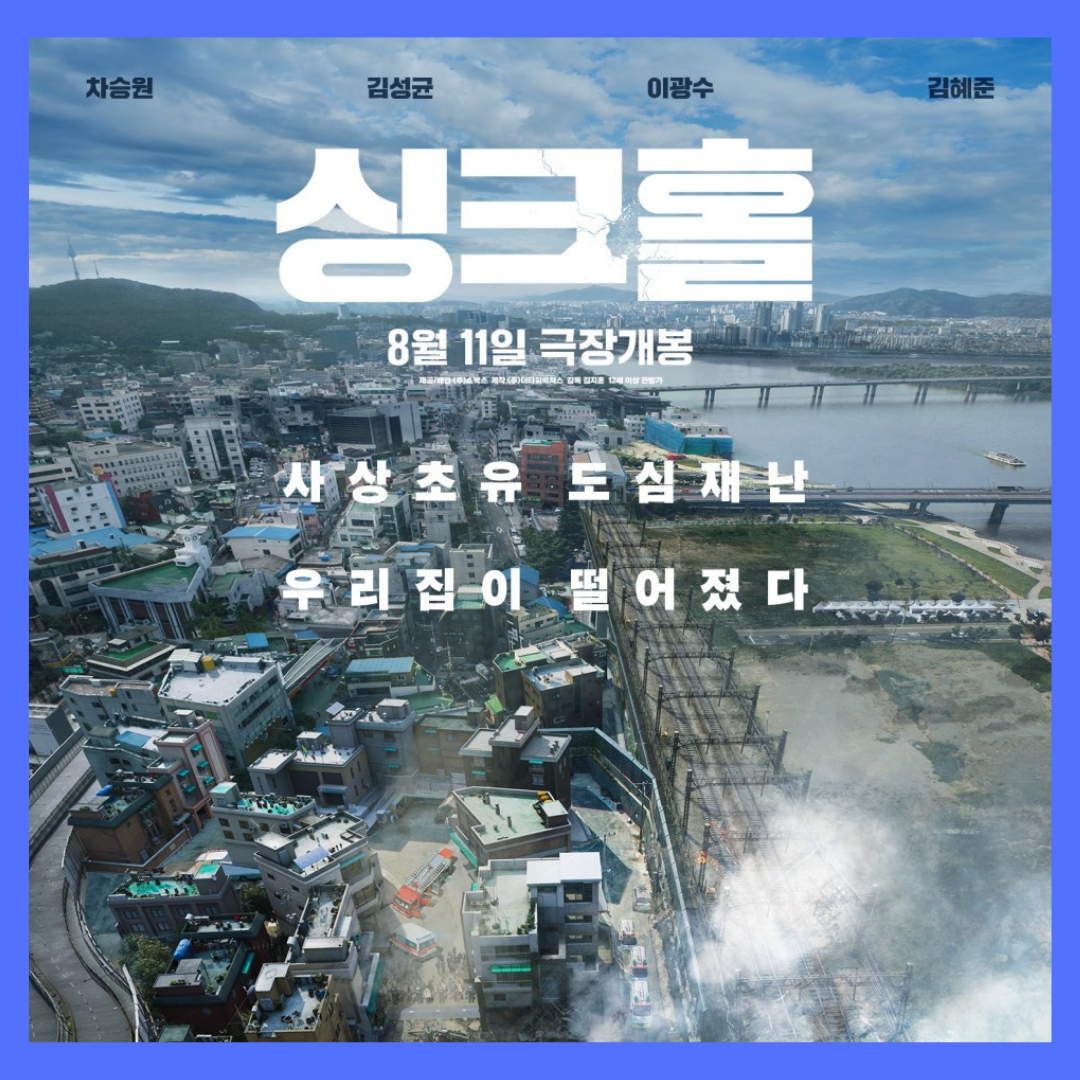 우선 코믹영화라니 가볍게 보기 좋을 것 같았고 싱크홀이라는 소재와 유쾌한 재난영화라는 시도가 마음에 들어서 이 영화를 골랐다. 김지훈 감독의 영화 싱크홀은 8월에 개봉한 작품이며 차승원 김성균 이광수 김혜준 남다름이 출연했다. 도심 속 초대형 재난.